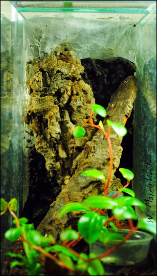 Terrariumpowinno mieć wymiary co najmniej: 15x15x30 (dł./szer./wys.). Młode pająki trzymamy w odpowiednio mniejszych pojemnikach, należy jednak pamiętać o tym, aby wysokość była dość duża. Jako podłoża używamy włókna kokosowego, torfu lub ich mieszanki w proporcji 1:1. Podłoża musi być na tyle dużo, by utrzymywało odpowiednią wilgotność. Dobrze do terrarium wsadzić tuby korkowe, gałęzie, patyki oraz roślinność. Pająk będzie budował gniazdo prawdopodobnie pod „sufitem” zbiornika.