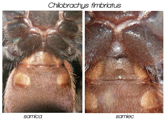 Dorosłe samice mają beżowy/jasnobrązowy karapaks z czarną „maską” wokół oczu. C. fimbriatus posiada piękny miedziany odwłok ze specyficznym czarnym, symetrycznym ornamentem: jeden pasek przechodzący przez całą długość odwłoka oraz kilka poprzecznych. Odnóża są ciemne, wpadające w brąz, a najbardziej wyraziste w nich są smoliście czarne uda z granatowym połyskiem. Natomiast biodra pozostają w jasnym kolorze karapaksu. Przy odpowiednim świetle lub pod pewnym kątem większość włosków, zarówno na odnóżach, jak i na odwłoku ma różowy, fioletowy lub granatowy odcień.