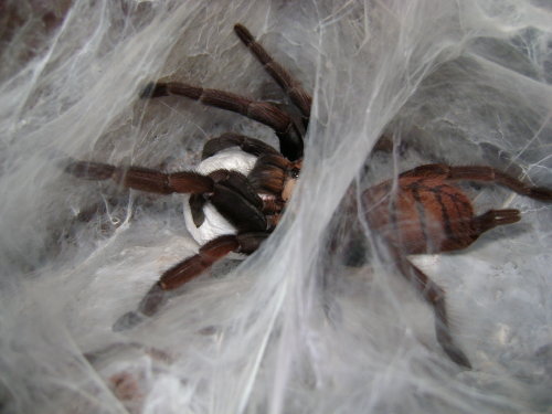 Stosunkowo proste. Samica rzadko bywa agresywna w stosunku do samca i często mogą przebywać ze sobą przez dłuższy okres czasu. Kokon jest budowany od 3-7 miesięcy po zapłodnieniu. Kokon może zawierać nawet do 300 jaj. Młode lęgną się po ok. 20-25 dniach, samodzielnymi pająkami stają się zaś po kolejnych 4-5 tygodniach.