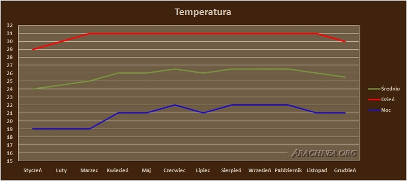 Temperatura 26-28°C z niewielkimi spadkami w nocy. Wilgotność na poziomie 70-80%.