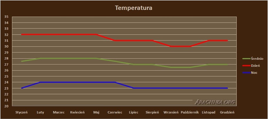 Za dnia optymalna temperatura to 25°C. Można stosować wyższe temperatury (25-28°C) jednak nie wolno doprowadzić do przesuszenia. W nocy może spadać nawet do 20°C, różnica nie powinna wynosić jednak więcej niż 5°C. Wilgotność utrzymujemy na poziomie około 80-85%