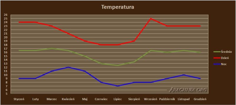 Na wolności temperatura maksymalna za dnia dochodzi do 25°C a średnia roczna oscyluje w około 21°C. W nocy maksymalna 12°C a średnia roczna 9°C. Także temperatura pokojowa w zupełności wystarczy i niewskazywane jest przekraczanie górnych granic temperatur dziennych naturalnego środowiska w którym występuje. Wilgotność wysoka, na poziomie 70-80% a nawet więcej.