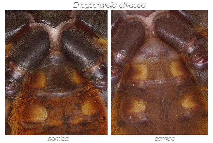 2. W 2003 r. Richard Gallon na podstawie holotypu samicy (wielkość 3.4 cm) opisał Xenodendrophila gabrieli która to potem okazała się tym samym gatunkiem. Gatunek olivacea jest jedynym przedstawicielem rodzaju Encyocratella. Pająk niezwykle defensywny, szybki i nerwowy. Mimo iż młode zazwyczaj salwują się ucieczką do gniazda wraz z wiekiem sytuacja na ogół się zmienia i nie wahają się przed ukąszeniem. Pająk posiadający umiejętność strydulowania. Plecie duże ilości efektownie wyglądającej pajęczyny. Już młode osobniki są jednymi z najlepszych tkaczy pajęczynowych gniazd wśród ptaszników. E. olivacea cechuje się silnym jadem jak większość afrykańskich ptaszników. Nie wyczesuje włosków parzących. Jako jeden z dwóch gatunków ptasznika, samica nie posiada spermateki, ale na wylince dużych sztuk wyraźnie widoczna jest błona.