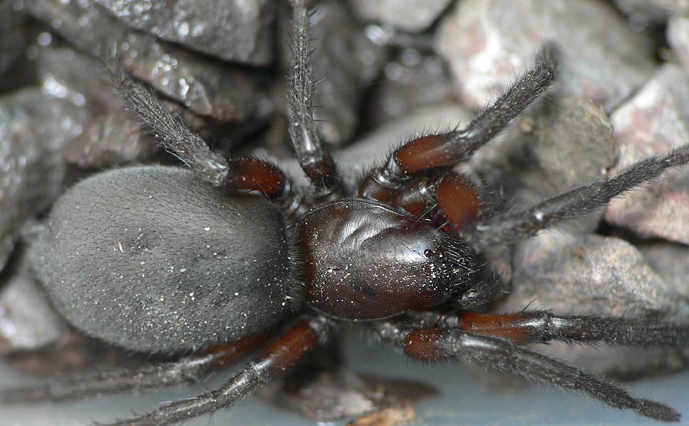 Głowotułów: Ciemny, szklisty, lekko brązowy; mało porośnięty włoskami, nieprzeświecający, wydłużony, brak szczególnego wysklepienia wzgórka ocznego – w przedniej części węższy (tam znajdują się specyficznie ułożone oczy. Odnóża: Szkliste, ciemne, brązowawo-czerwonawe, lekko przeświecające, krępe, bardzo mało obrośnięte włoskami – sprawiają wrażenie nagich. Szczękoczułki duże, skierowane pionowo do dołu.