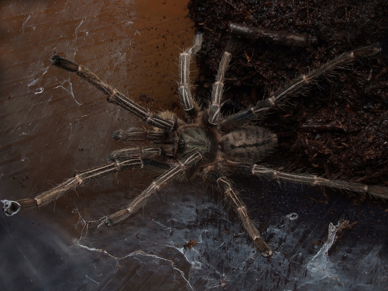 Gatunek ten jest najmniejszym przedstawicielem rodzaju, dorasta do około 6 cm samego ciała, z rozpostartymi odnóżami osiągają rozmiary około 13-14 cm. Młode osobniki są ciemnoszare. U podrostków i osobników dorosłych cechą charakterystyczną są kremowobiałe, cienkie paski biegnące wzdłuż odnóży. Nie znikają one również u dorosłych samców, co jest cechą szczególną. Podstawowe ubarwienie bywa bardzo zróżnicowane od szarości, brązów aż po czerń. Wynika to z miejsca pochodzenia, wieku i czasu od ostatniej przebytej wylinki. Najbardziej efektownie prezentuje się formy czarne i jasne.