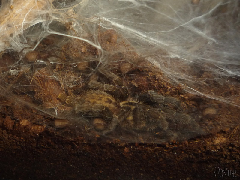 Samice są dorosłe już przy wielkości 2,5 cm DC. Dorosłe samce nie posiadają haków goleniowych! Samiec po kopulacji oddala się od samicy w błyskawicznym tempie. Liczba jaj w kokonie zazwyczaj mieści się w przedziale 50-150 sztuk. Czas złożenia kokonu od kopulacji zazwyczaj krótki – miesiąc/półtora. Odnotowano przypadek złożenia kokonu 13 dni po kopulacji. Młode można pozostawić z matką, będą razem polować w grupie. O ile zapewnimy wystarczającą ilość pokarmu, to nie powinien mieć miejsca kanibalizm wśród potomstwa.