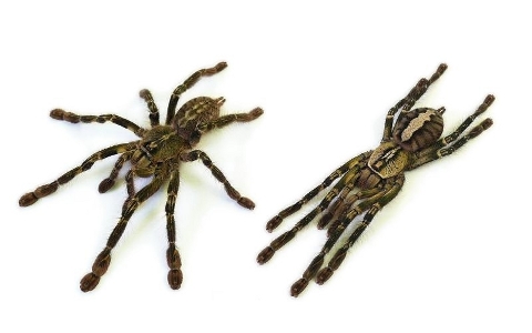 - wyraźną czarną plamką przy nasadzie uda I i II nogi (po wewnętrznej stronie); czarnymi pręgami tylko około o połowę węższymi niż żółta część od strony nasady nogi oraz białym obszarem uda IV zredukowanym do białej plamy widocznej w części bliższej nasady uda – czyli osobniki należące do gatunku → Poecilotheria ornata