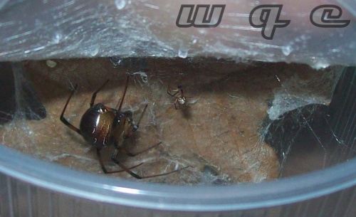 Dorosłe osobniki, gdy zapewni im się większa przestrzeń prócz zwykłej sieci budują także specjalne lepkie, pojedyncze nici, które spuszczane są na dno pojemnika. Można więc karmić także naziemnym pokarmem, który przyklejając się do takiej nici swymi ruchami zaalarmuje wdówkę. Ta następnie wciąga taką ofiarę do góry, by ją zabić a następnie skonsumować.