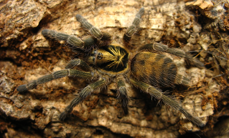 Dorosłe samice tego gatunku mierzą tylko około 3-4 cm ciała, a z rozpostartymi odnóżami 6-8 cm. Pięknie ubarwiony niewielki ptasznik. Odnóża to mieszanka koloru żółtego, złotego i zielonego, co w rzeczywistości oddaje kolor oliwkowy. Karapaks ma złocisty ornament na czarnym tle. Jedynie odwłok nieco jaśniejszy z ciemnymi skońsnymi pasami.