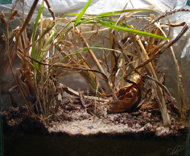 Terrariumdla dorosłego osobnika powinno mieć wymiary minimum 15/15/15 cm, jednak im większe tym damy samicy większe pole do popisu w kwestii pajęczynowania. Jako podłoża można użyć mieszanki piasku i włókna kokosowego, a wystrój mogą stanowić kamienie, suche trawy i kawałki kory. Jednak wcześniej czy później cała aranżacja pojemnika będzie pokryta grubą warstwą pajęczyny.