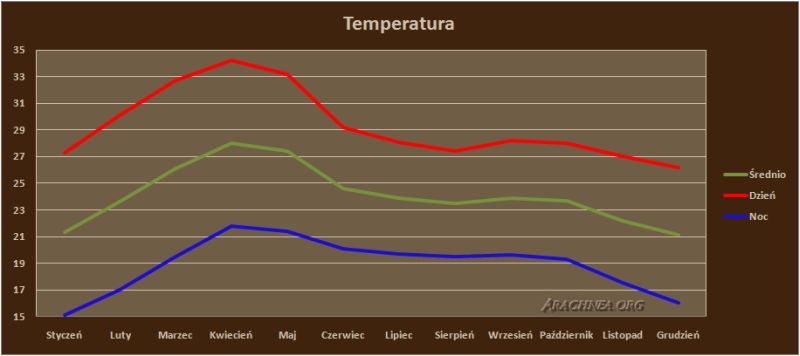 Temperatura w Terrariumpowinna wynosić 26-28°C za dnia, oraz kilka°C mniej ok. 20-22°C w nocy. Wilgotność należy na poziomie 70-80%.