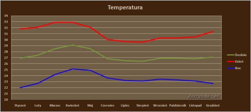 Temperatura w terrarium powinna wynosić 27-29°C za dnia, oraz kilka°C mniej ok. 22-24°C w nocy. Wilgotność należy na poziomie 70-80%.