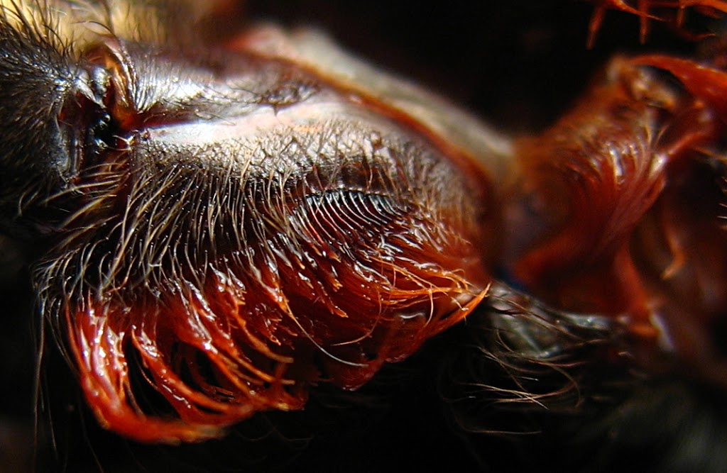 Narządy strydulacyjne na wewnętrznej bocznej stronie szczękoczułek. Zdjęcia autorstwa Obli.