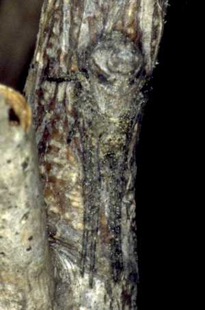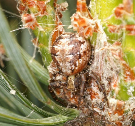 Tego pająka ciężko odnaleźć. W swoim otoczeniu, które stanowią gałęzie i konary drzew iglastych i krzaków, jest praktycznie niewidoczny. Pająk można łatwo rozpoznać po kształcie odwłoka i charakterystycznej pozycji. Występuje w rozmiarach 3-6 mm.