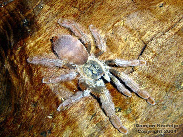 Ubarwienie jednolicie jasnobrązowe, rude, przy odpowiednim oświetleniu mieniące się na różowo. Karapaks o złotym połysku. Dorosłe samce tracą na swym ubarwieniu. Małe pajączki z charakterystycznymi czarnymi końcówkami na Tarsus. Typowa wielkość dorosłej samicy – 4-5 cm DC i ponad 10 cm z odnóżami. Samce odpowiednio mniejsze.