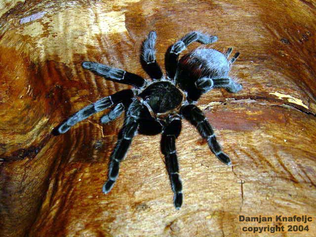 Dorosłe samice tego gatunku mierzą około 7-8 cm ciała, a z rozpostartymi odnóżami 12 cm. Dominującym kolorem ubarwienia tego ptasznika jest czerń. Zarówno karapaks, odnóża jak i odwłok są czarne. Dodatkowo dwa ostatnie mają słabo widoczny granatowy połysk. Odwłok porośnięty gęsto jasno-rudymi włoskami.