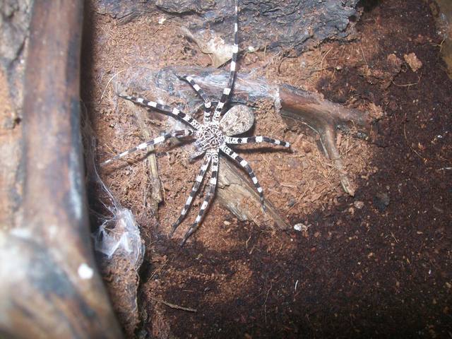 Pająk bardzo ciekawie ubarwiony. Białe ciało pokryte czarnymi plamkami i cętkami tworzy prześliczną mozaikę. Odnóża dość długie i masywne w stosunku do ciała, pokryte są naprzemiennie biało czarnymi prążkami. Samiczki są większe i masywniejsze od samców dorastając do 2-2,5 cm dc, z odnóżami do ok 8 cm.